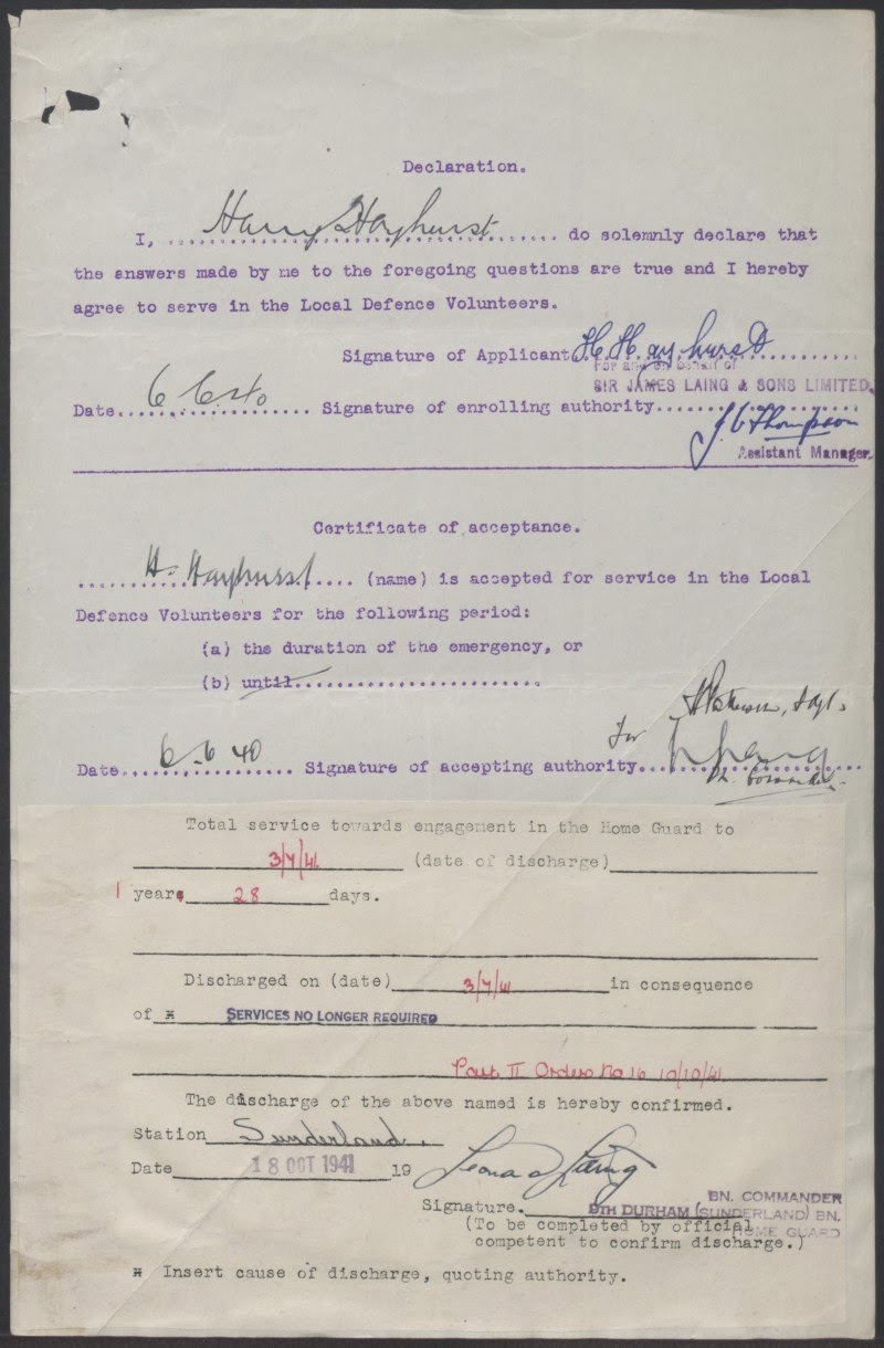 I've mentioned my grandfather before, and of how he was a regular soldier, wounded at Ypres in 1915 and how he ended up serving, first in the Tyne-Tees Coastal Defence force, and later the Army Service Corps and how he made his home in Sunderland. Sadly his army records are among the many lost what the warehouse was bombed in 1940, but I recently found his LDV enrolment papers from June 1940.